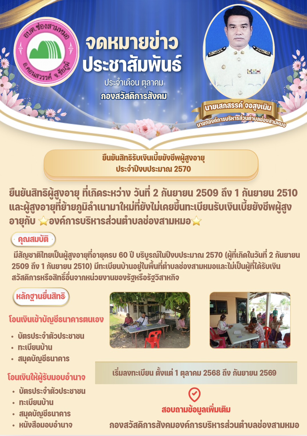 ประชาสัมพันธ์ยืนยันสิทธิรับเงินเบี้ยยังชีพผู้สูงอายุ ประจำปีงบประมาณ 2570 องค์การบริหารส่วนตำบลช่องสามหมอ อ.คอนสวรรค์ จ.ชัยภูมิ
